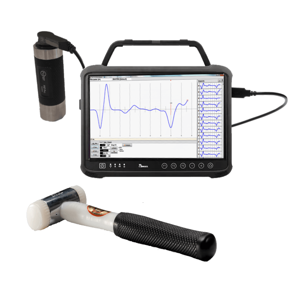 El PET utiliza el método sónico de eco (Low Strain Integrity Test). Se aplica un pequeño golpe en la cabeza de la pila con un martillo instrumentado, y el sensor registra la onda reflejada dentro de la cimentación.